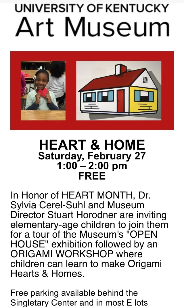 Dr Cerel-Suhl teaching families in a workshop "Heart and Home" at The University of Kentucky Art Museum, Lexington, KY, February, 2016.
