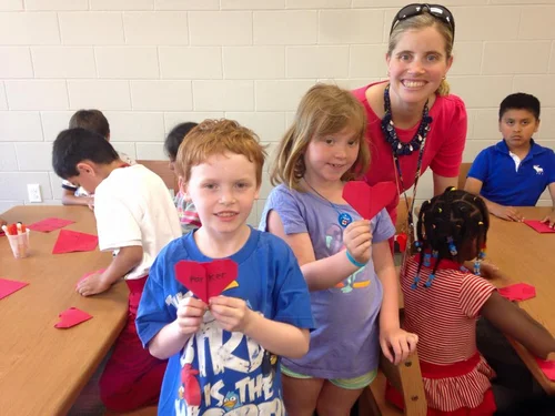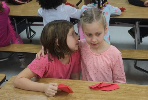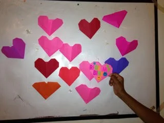 Glendover Elementary School Second Graders and teacher, happy with their origami hearts, after a fun day of problem solving and creativity with art!