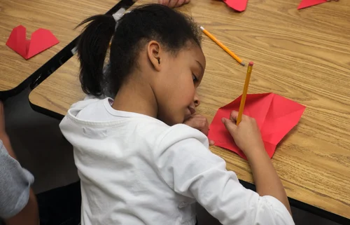 Second grade Maxwell Elementary student writing how she wants to move and stay active on her third heart. photo: Lexington Herald-Leader, Tom Eblen.