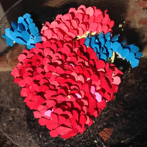 Group projects are created from individual origami folded shapes. Hundreds of donated origami hearts are combined to create giant works of environmental advocacy art. We have collected thousands so far.